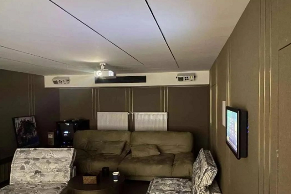 私人影院選用加拿大的品牌百里登作為影院的主音箱、環繞音箱、吸頂音箱及低音炮,四面環繞,增加觀影沉浸感,更容易代入其中,觀影更真實!140寸畫框4K透聲幕,實現聲音透過的同時,也確保畫面清晰明亮,增添畫面飽和度!